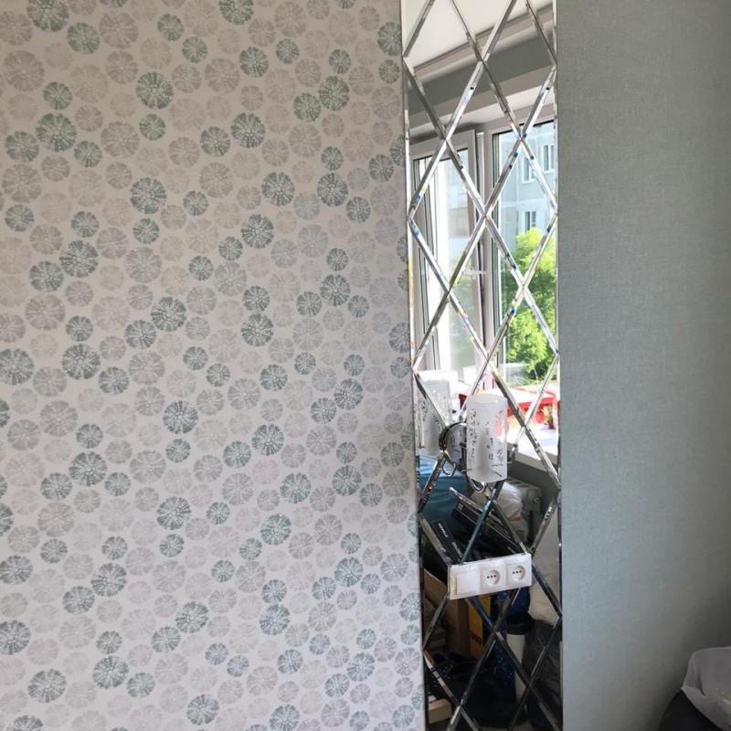 Для украшения использовалась зеркальная плитка формы вытянутый ромб серебряного цвета.