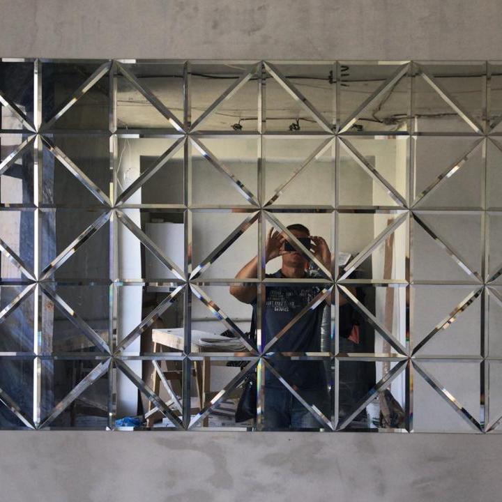 Интересна выбранная форма плитки – треугольник. Чем меньше размер выбранной для панно плитки, тем менее само панно воспринимается, как зеркало. В таком виде оно скорее играет роль декора, хотя никто не отменил его отражающую способность и связанные с ней выгоды.