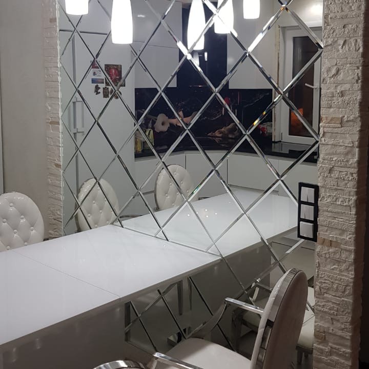 Использована серебристая квадратная зеркальная плитка размером 18х18.